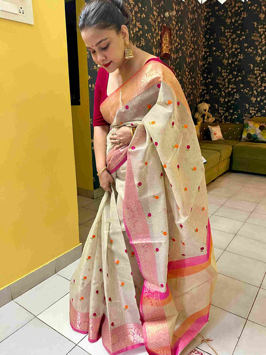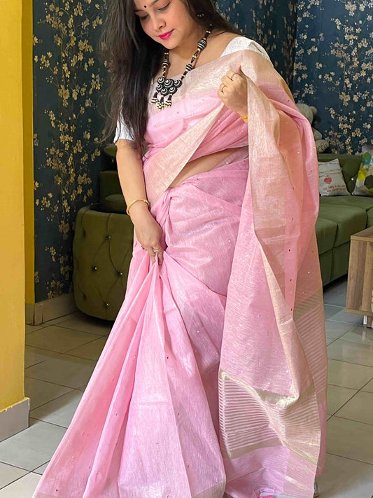 Linen Pink Zari Saree – White Silver | Desi Aadat
