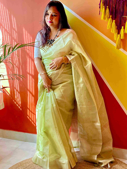 Cotton Tissue Kota Saree with Mirror Embroidery - Pista Green | Desi Aadat