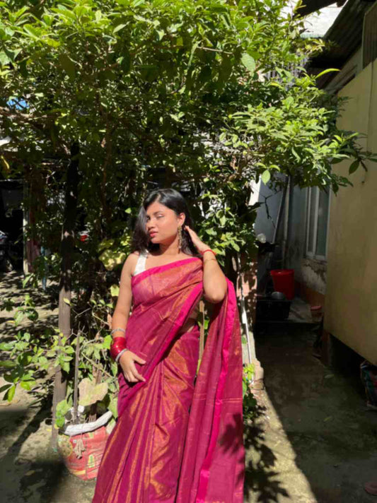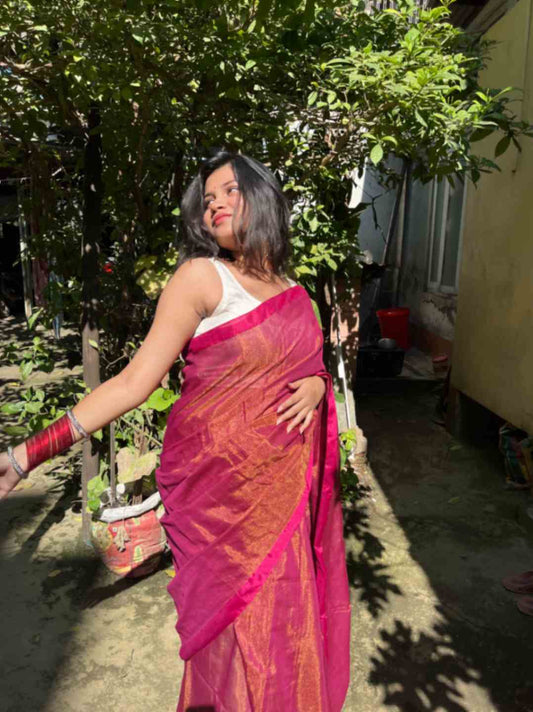 Linen Saree with Golden Zari in Maroon | Desi Aadat