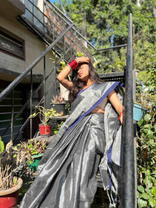 Grey Silver Linen Saree with Blue Zari | Desi Aadat