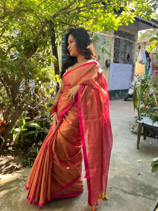 A Cotton Tissue Saree is made from cotton fabric with an added tissue fabric weave, making it lightweight, breathable, and slightly glossy for an elegant look.