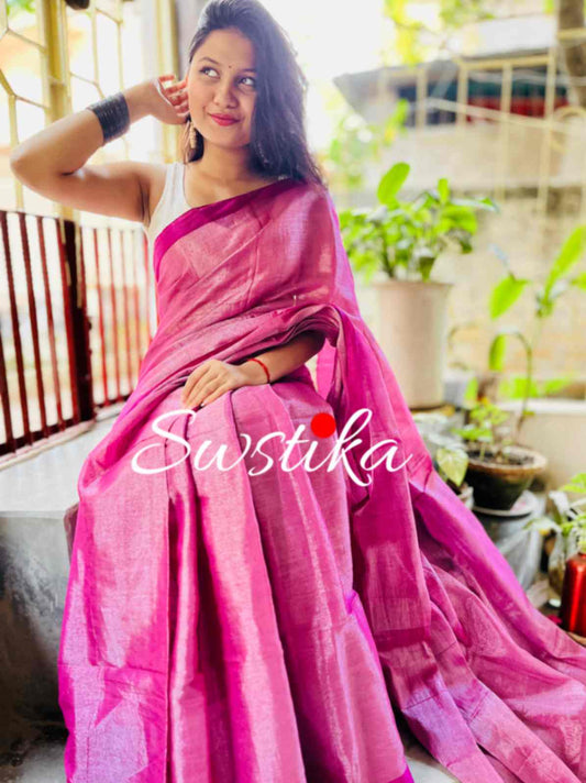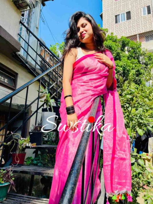 Linen Saree with Silver Zari in Pink | Desi Aadat