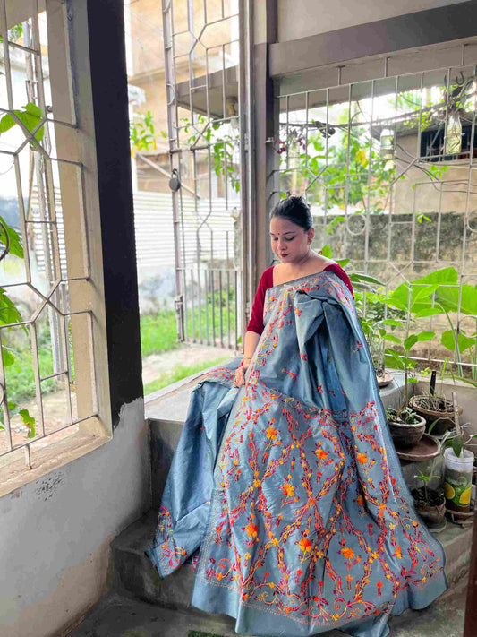 Parsi Gara Work on Semi Tussar Silk Saree – Grey | Desi Aadat