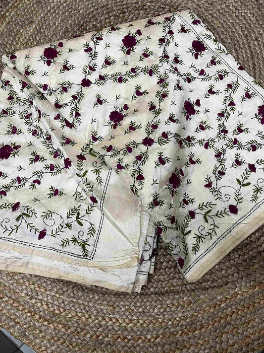 Parsi Gara Work on Semi Tussar Silk Saree – Off White | Desi Aadat