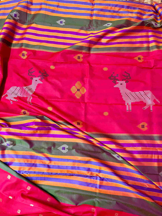 Semi Katan Kalakshetra Silk Saree with Deer Design – Bottle Green | Desi Aadat