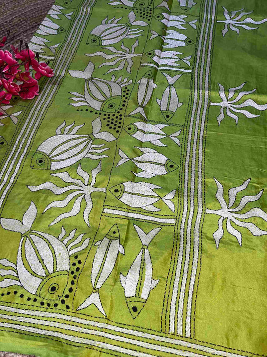 Kantha Stitch with Fish Motifs - Green Blended Bangalore Silk | Desi Aadat